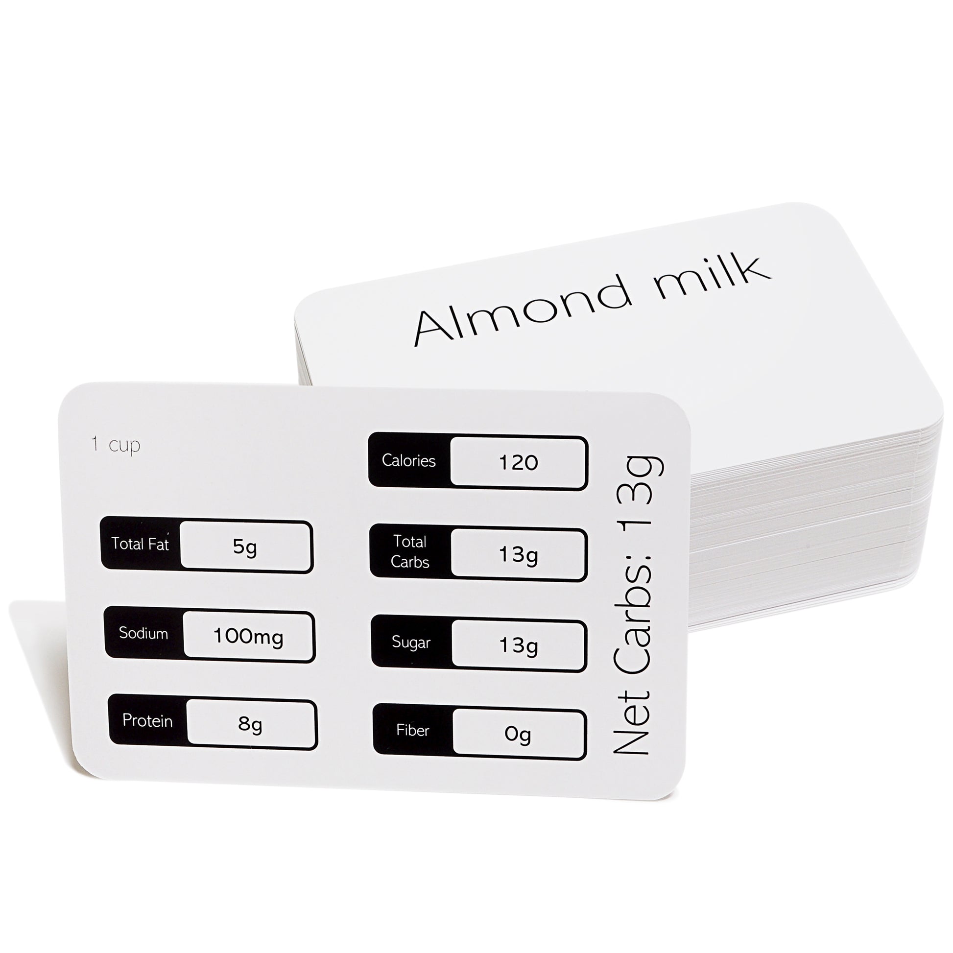 - The most comprehensive nutrition flash card set available. 122 cards. Each card has the essential nutritional facts including calories, total fat, sodium, carbohydrates, fiber, and net carbs.