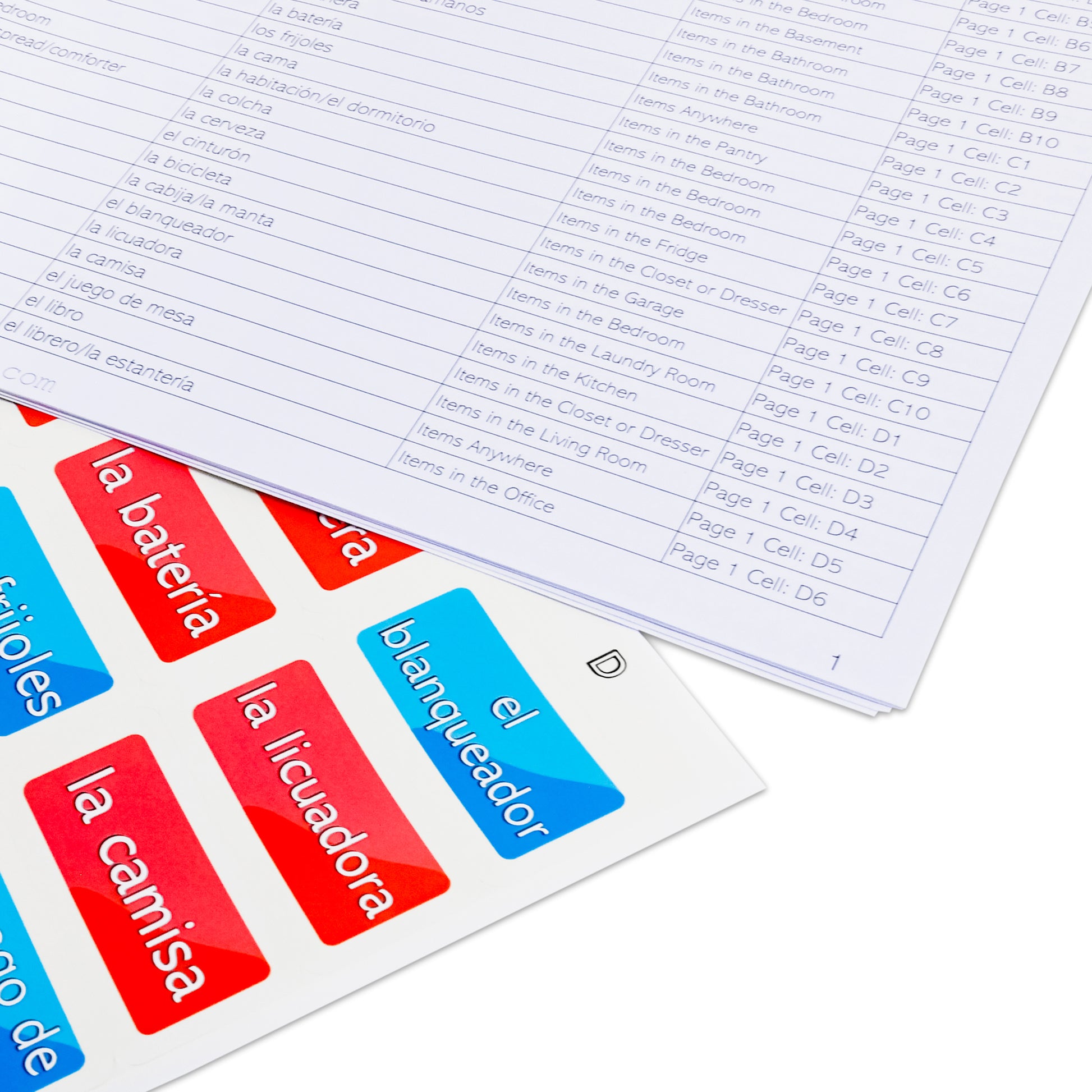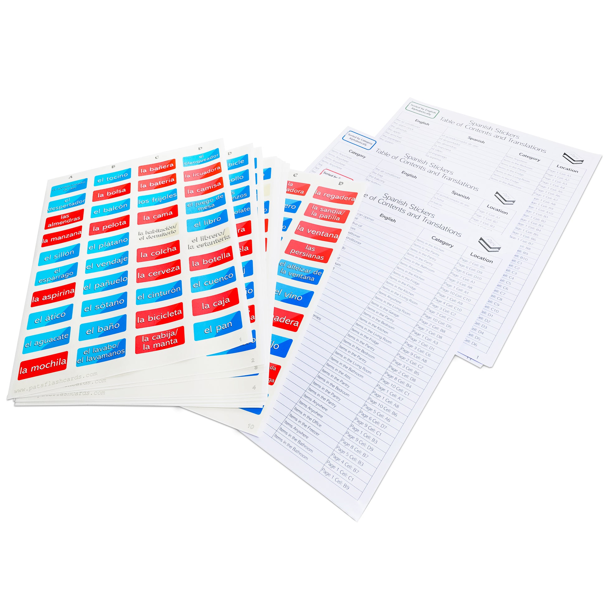 - You also get three lookup table packets. These allow you to see the English, Spanish, and location (ie the row and column) of the sticker. See the photos to see these time-saving lookup tables in action.