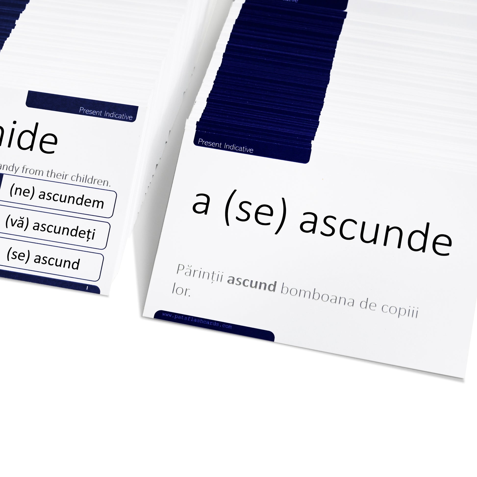 - Romanian flash cards covering vocabulary and verb conjugation. Includes 200 verb conjugation flash cards and 200 picture cards.
